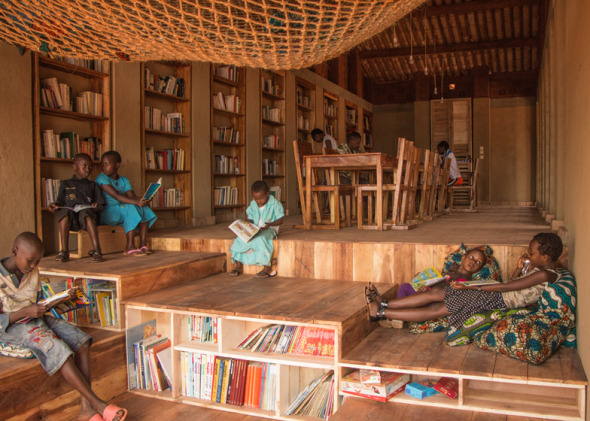 Me hubiera gustado encontrar alguna noticia sobre el fondo bibliográfico que alberga, con la esperanza de constatar que al igual que se ha tenido gran cuidado en el exterior a la hora de levantarla, utilizando técnicas y materiales locales, también se puede leer allí literatura local y africana en general. Sin embargo, toda la información que he localizado sobre ella gira en torno a este exitoso proyecto arquitectónico, aunque las columnas de libros enmarcadas entre lamas de madera natural, los niños leyendo tumbados en hamacas y el entorno que se divisa desde los ventanales, sea más que suficiente para producir sana envidia.