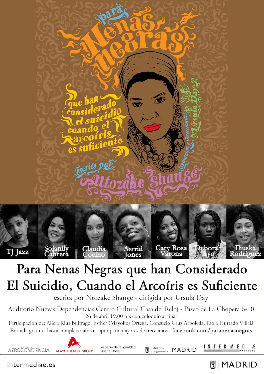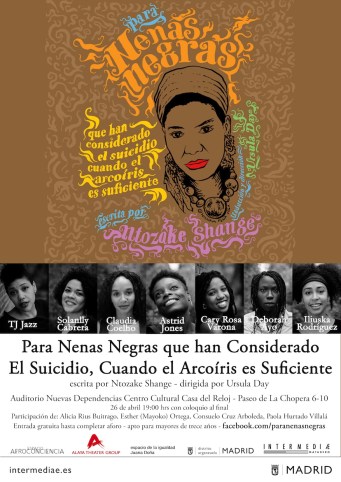 Ursula Day se enamoró por completo de la obra, cuando tenía diecisiete años, y decidió dedicar todo su empeño en conseguir los derechos de autoría en exclusiva, traducirla al castellano y llevarla al teatro. Así, bajo el título Para Nenas Negras que han Considerado El Suicidio, Cuando el Arcoíris es Suficiente, se hallan 20 coreopoemas. Lo anterior propició la representación por piezas de la obra, entre 2012-2016, en diversas ubicaciones, como Madrid o Ibiza. Hasta que en 2015 la directora neoyorkina consiguió formar el elenco actual compuesto por TJ Jazz, Solanlly Cabrera, Claudia Coelho, Astrid Jones, Cary Rosa Varona, Deborah Ayo e Iliuska Rodriguez. Y en julio de 2016 por fin la pudieron representar por primera vez en toda su extensión.