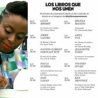 Más cerca de nosotros, Los libros que nos unen, de la mano del periodista Moha Gerehou es un proyecto que surgió, en un principio, en torno a la idea de crear un Club de Lectura en la librería Traficantes de Sueños de Madrid. Ahora, se ofrece en Instagram, en directo. Todos los libros elegidos tienen temática racial; se ha conversado sobre La estación de la sombra con Lucía Mbomío o sobre Americanah con Helena Maleno. La última conexión será el 10 de este mes con Ken Province.